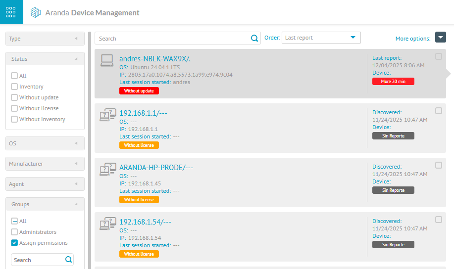 To filter the information of inventoried devices, the following selection categories are available:
