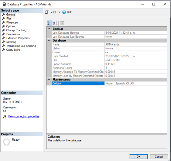 - Verify that the database is located in a different collate than SQL_Latin1_General_CP1_CI_AI. Right-click on the Database > properties