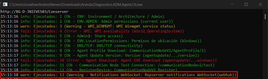 3. Run the file as administrator Aranda.Diagnostics.ADM.Agent.Cli.exe; Once executed, the utility vehicle performs the tests of architecture, services, accesses, permits, communication ports.