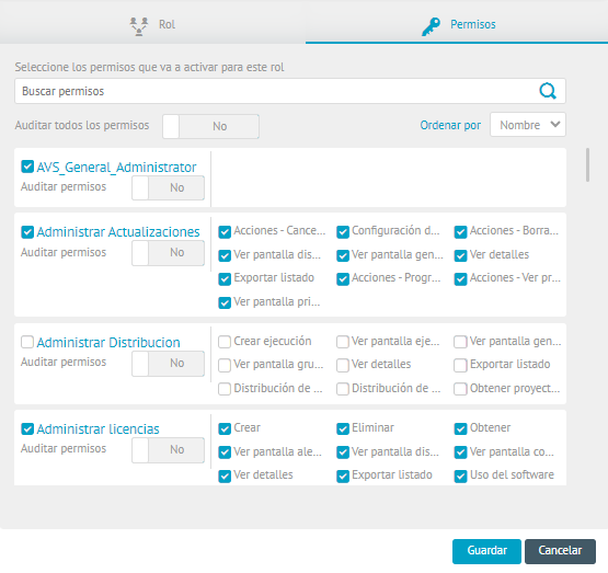 4. Na visualização Detalhes da função, clique no botão Permissões e ativar as permissões necessárias para a função selecionada nos diferentes processos de gerenciamento do ADM