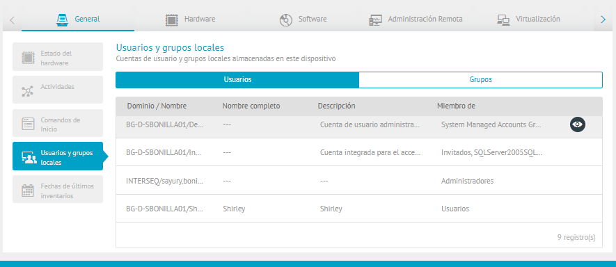 Esta seção exibe informações relacionadas a usuários e grupos criados anteriormente.
