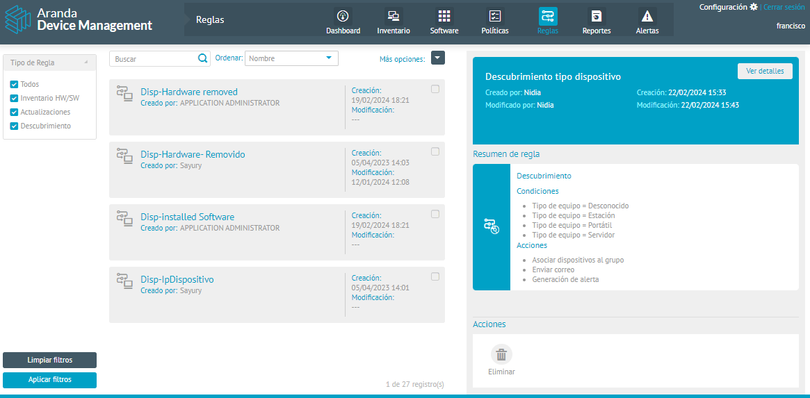 O módulo de regras é usado para automatizar processos recorrentes. Por meio de instruções e condições predefinidas, processos como atualização de patches ou execução de ações após a descoberta de dispositivos no inventário podem ser executados automaticamente, é possível agendar o download de atualizações, agendar o envio de execuções, notificar alertas ou enviar notificações por e-mail.