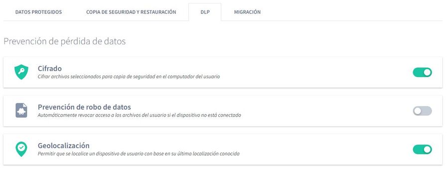 Visualize the choices you can make in the sections Protected data, Backup and restore , DLP and Migration.