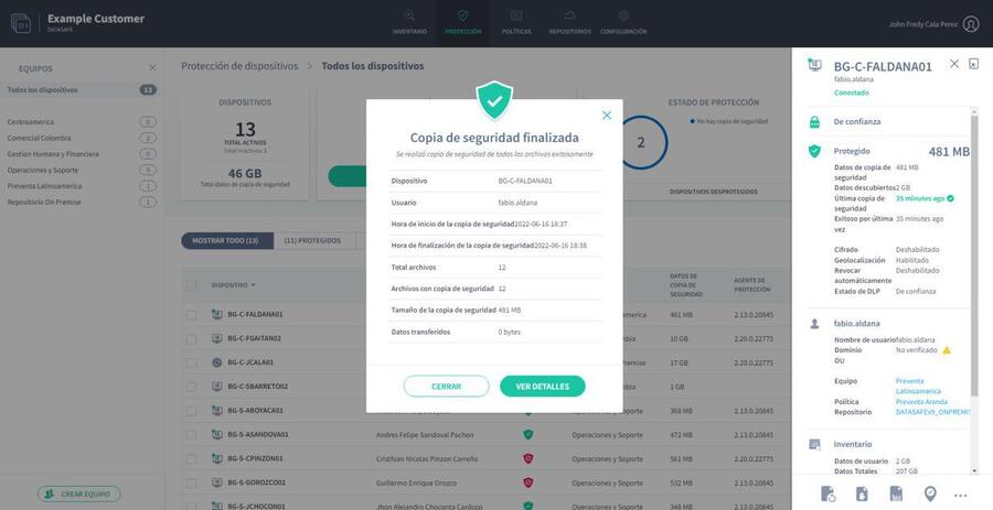 5. Quando o backup estiver concluído, clique no link na entrada Último backup na guia Detalhes da página de perfil do dispositivo. O Aranda Datasafe exibe um resumo do backup.