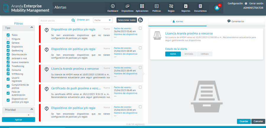 To view the alerts in detail, select the alerts icon, or any of the options presented by the pop-up view with the summary of alerts, in this way you can see the detail of the alerts filtered by its severity or see all alerts.