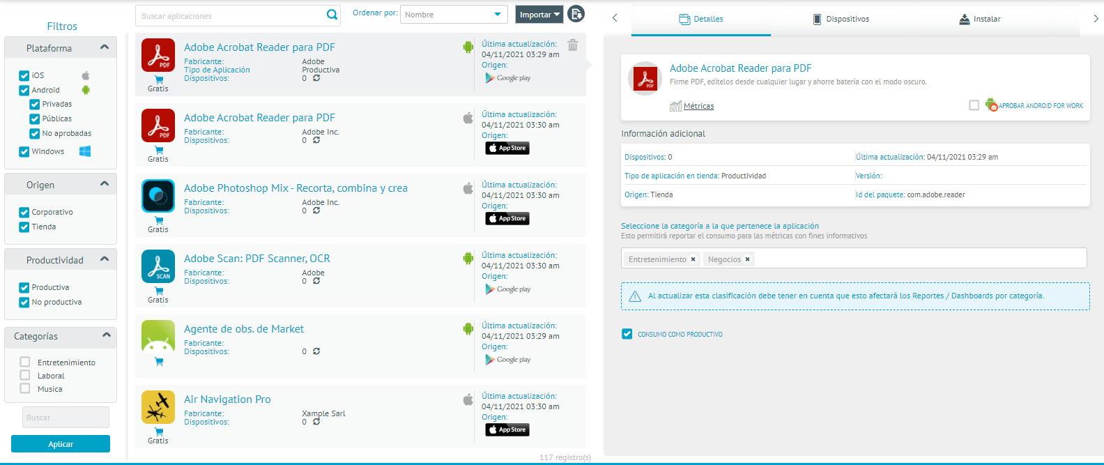 In this section you will be able to view all the applications that have been found through the inventories of the devices and as a result of importing applications from each of the stores (google play and app store).