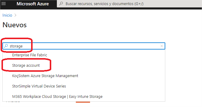 - Type the word “storage” into the resource search bar, then click “Storage Account.”