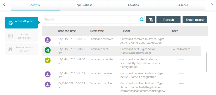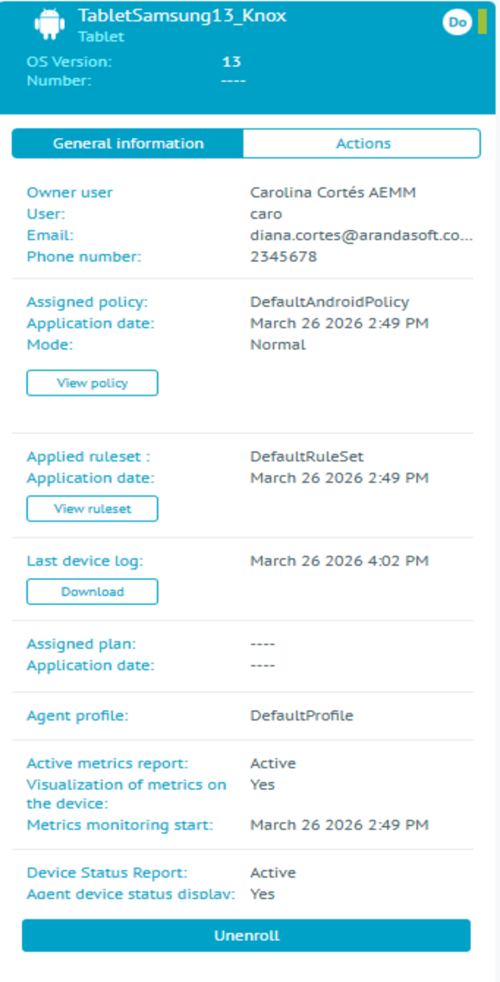 In the information view of the AEMM Starter Console, you will be able to display Actions (Commands). The actions correspond to commands that are sent to the device so that it in turn executes them and reports the result to the Aranda ENTERPRISE MOBILE MANNAGEMENT AEMM server.