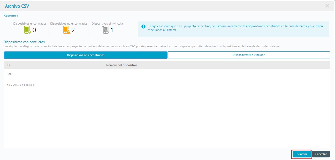 This feature allows you to create groups (Projects) of devices and send configurations to them in a unified or bulk manner. This is done through the creation of a . CSV with the Imei of the computers to which the configuration will be sent.