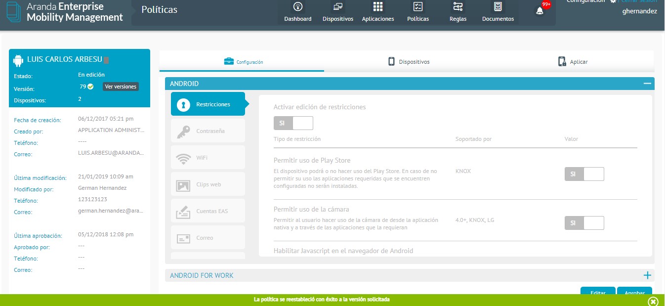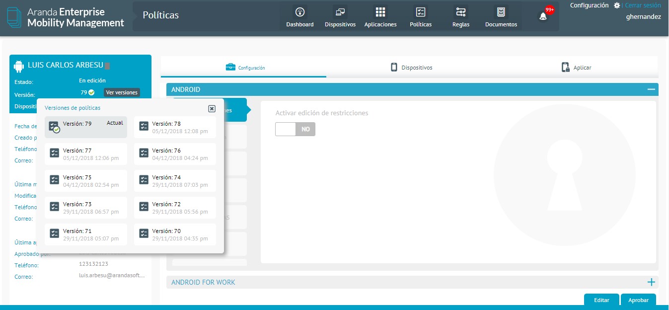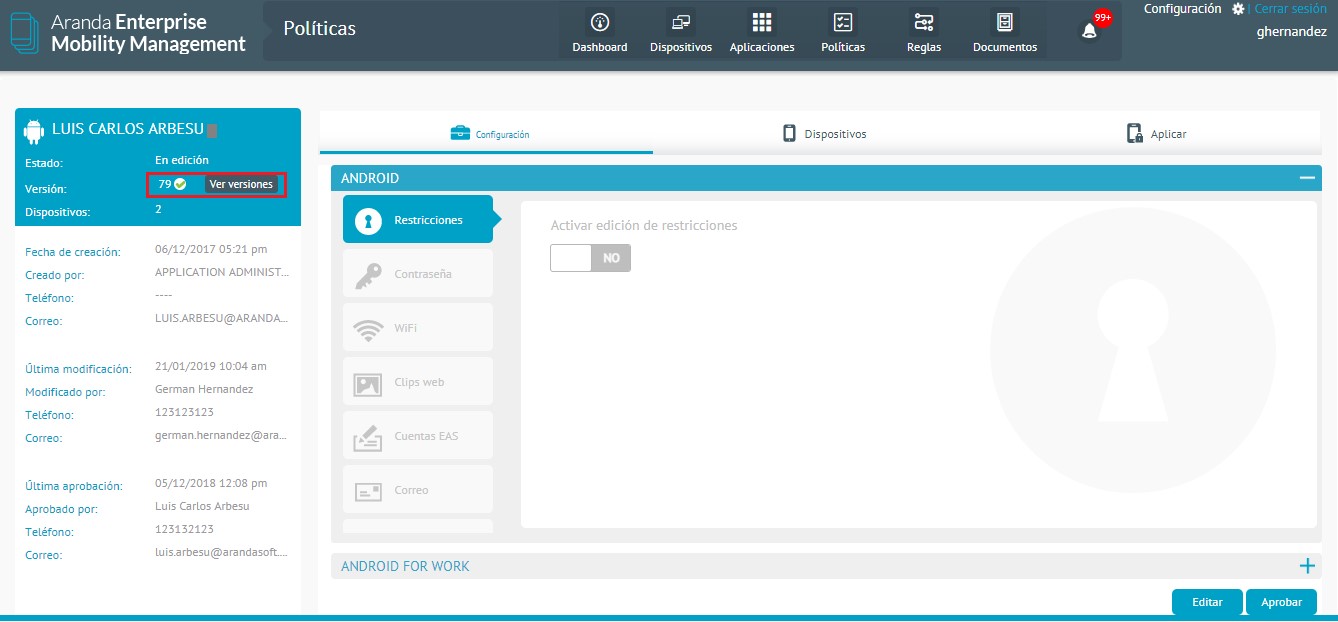 For each change you make to the policy, the version number increases. It should be clarified that if the policy is not approved, the version that applies to the device is the last one approved.