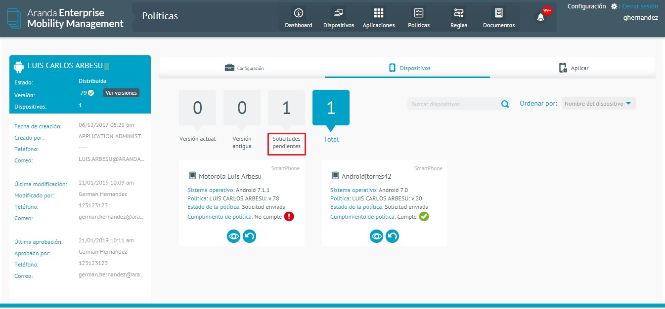 - If the policy is applied and it remains as “Pending Requests” it is It is necessary to validate if the mobile device has connectivity problems.