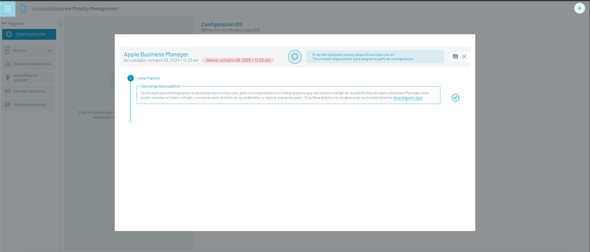 The MDM file will be downloaded_ Aranda Software Corp_Certificate.pem, save it in a safe place and click Next.