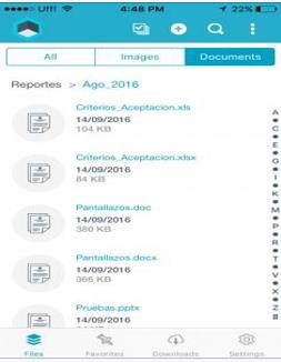 Possui as visualizações Arquivos (Exibir todos os arquivos e pastas), Favoritos, Downloads, Configurações. Este menu é visível na barra de opções na parte inferior da tela.