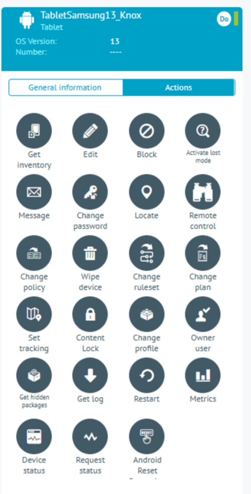 Na exibição de informações do AEMM Starter Console, você poderá exibir Ações (Comandos). As ações correspondem aos comandos que são enviados ao dispositivo para que ele, por sua vez, os execute e relate o resultado ao servidor Aranda ENTERPRISE MOBILE MANNAGEMENT AEMM.