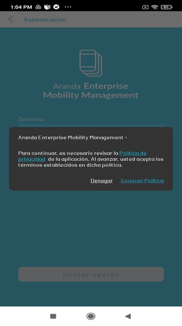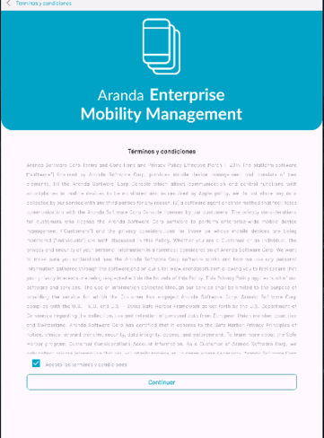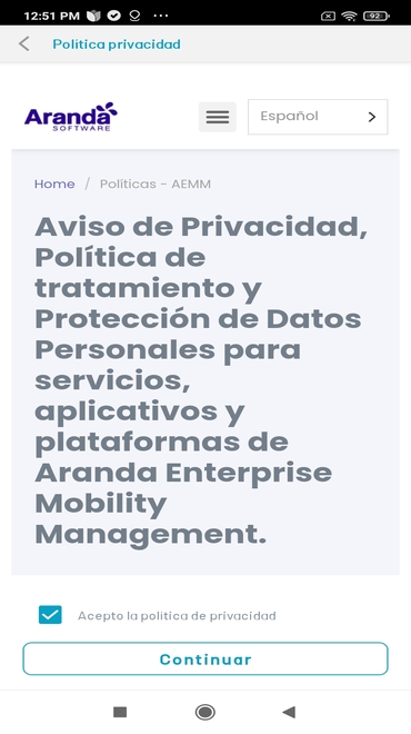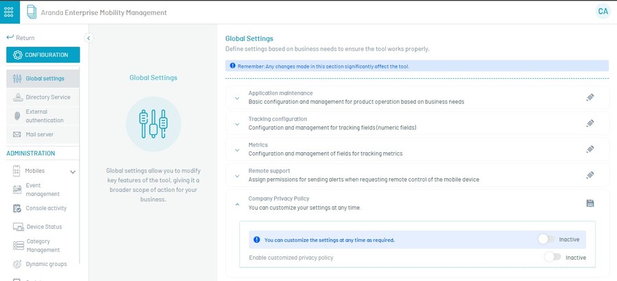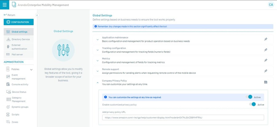 O administrador pode ativar a exibição de “Política de Privacidade do Cliente” no aplicativo móvel para o processo de vinculação de agentes AEMM; isso é para que o usuário final da empresa esteja ciente e aceite essa política antes de usar o aplicativo AEMM.