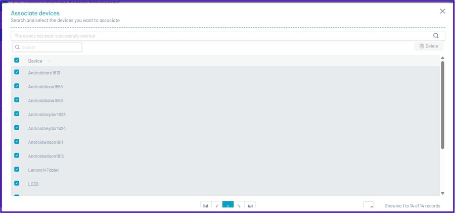 - Para dissociar um ou mais dispositivos, selecione o(s) registro(s) correspondente(s) e clique na opção “Excluir”