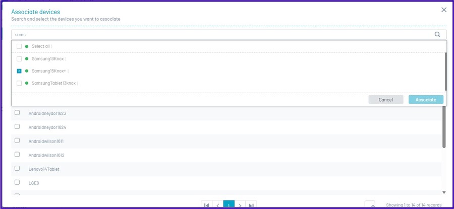 - Para associar novos dispositivos ao relatório de status, na busca de dispositivos, insira o nome do item a ser associado e clique em “Associar” para adicioná-lo à lista de dispositivos.