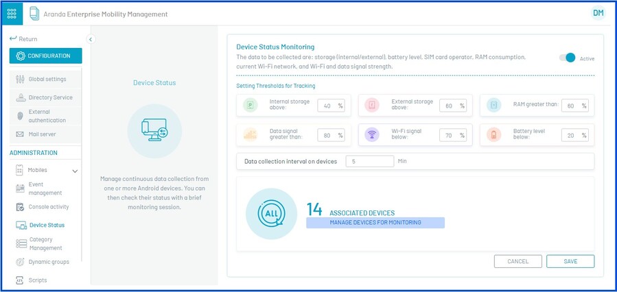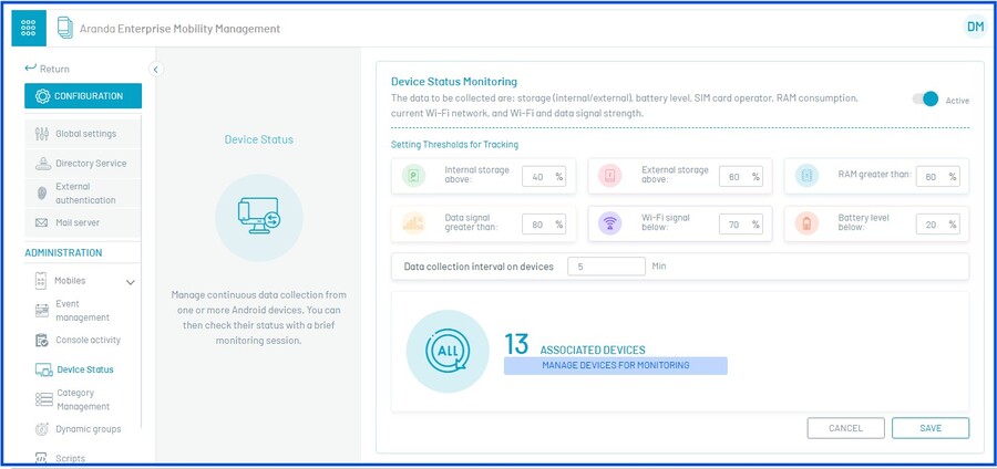 1. Para definir o status dos dispositivos, você deve inserir o console de opções de configuração no Aranda ENTERPRISE MOBILE MANAGEMENT AEMM, na Preferências No menu principal, selecione o ícone Status do dispositivo. Na Visualização de detalhes, você pode configurar limites e editar os dispositivos associados.