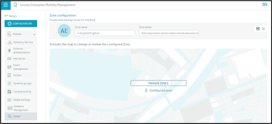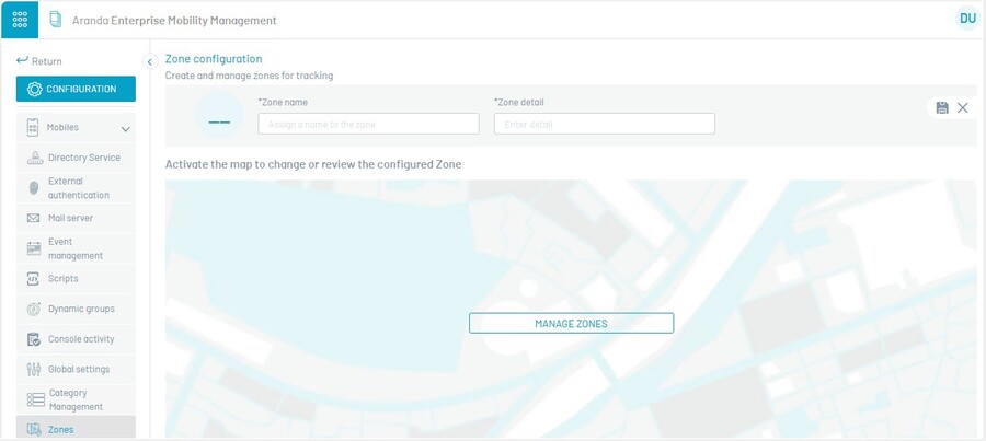 A seção zones destina-se a gerenciar os sites ou faixas que posteriormente serão utilizados na configuração de conjuntos de regras que possuem o item “Geofencing” (Fronteira Geográfica).