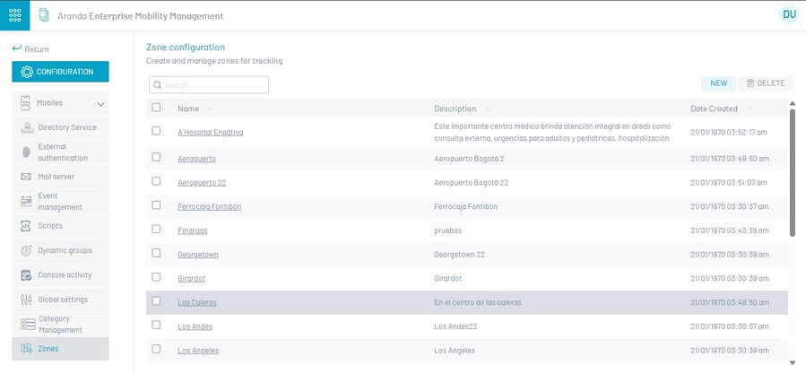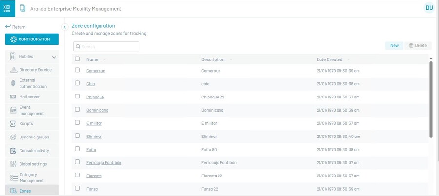 Para configurar uma zona geográfica, vá para a seção de zonas e clique em Novo.
