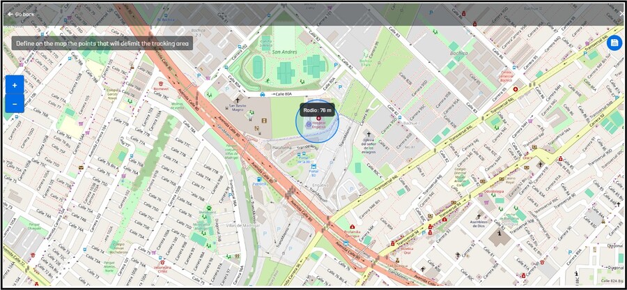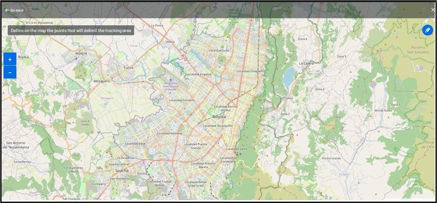 Depois de clicar em Gerenciar zonas, será exibido um mapa onde o administrador pode pesquisar e selecionar a zona, ele deve clicar no círculo azul e soltar para marcar o centro da zona, e ele deve mover o cursor para expandir ou diminuir o raio da zona, clique no final para terminar de desenhar a zona.