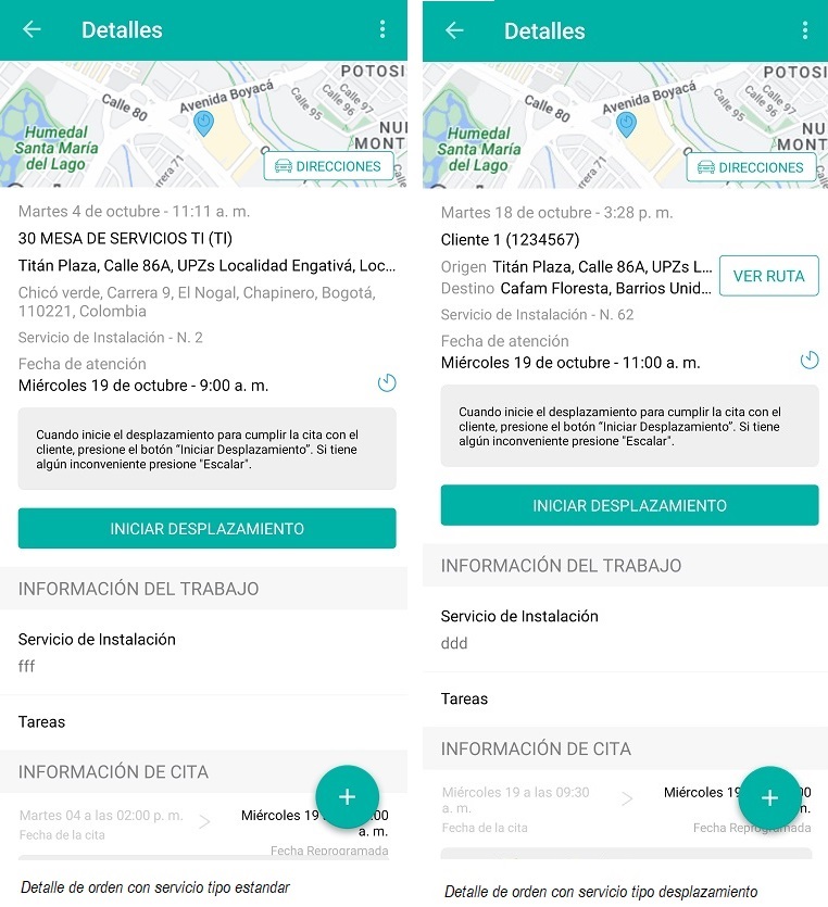 In the case of an order with a Displacement type service, the specialist may also use the option SEE ROUTE to view the proposed route through the map application that the device has configured by default.