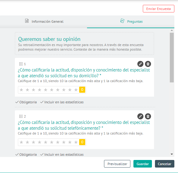 | Measurement Time: | This option defines the period in which the measurement is made; it can be Monthly, Weekly or Daily. This measurement is used to send a report to the monitors with the weighting of the level of satisfaction for each template of all the surveys answered in that period. |