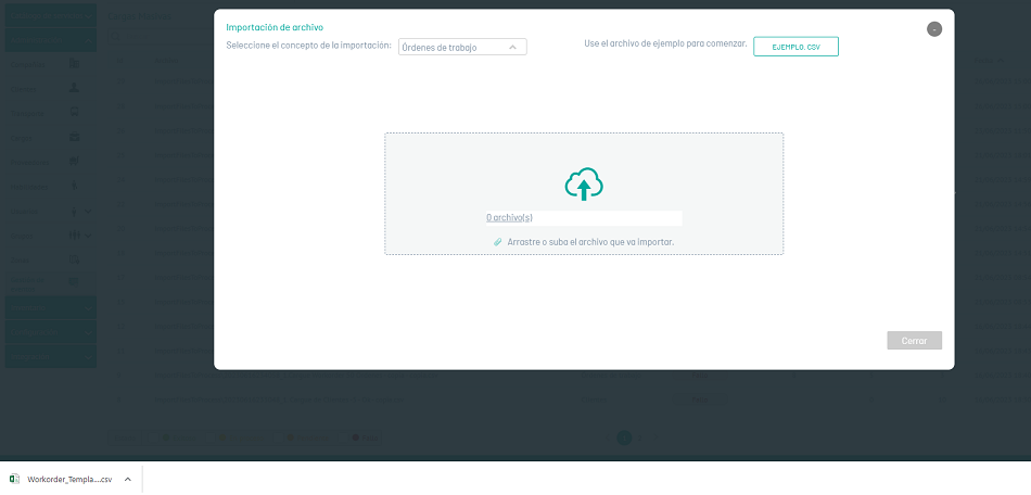 In the Import View you can select the type of upload you want to perform, taking into account the selection it is possible to upload a file of the orders, movements or customers you want to add; when selecting the EXAMPLE. CSV You will be able to download a template to import.