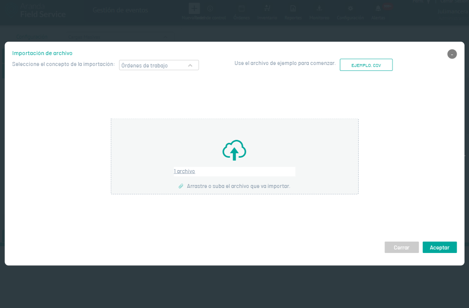 7. Import is a functionality that allows customers, orders and movements to be uploaded in bulk to Aranda FIELD SERVICE, through an Excel .csv file, with a specific format that allows records to be managed and created more efficiently.
