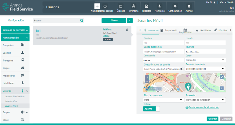 ⚐ Note: For web users with the Dispatcher or Monitor the option will be enabled for them Allow the user to perform bulk actions, which allows the Dispatcher to activate permissions in the Orders module to perform bulk uploads and select the bulk actions option, while the Monitor directly enables the execution of bulk actions. All users defined for the management of the service will be in state “Active”, for the attention of the work order.