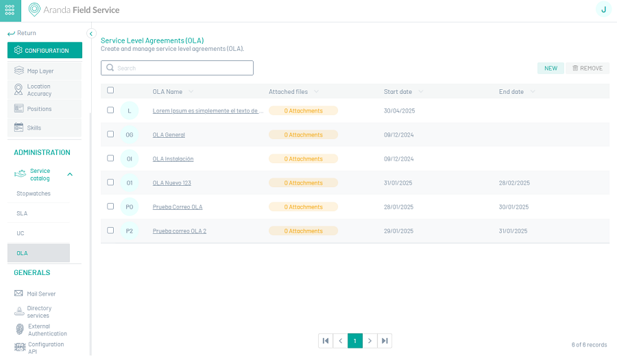 5. Para editar un acuerdo de Nivel de Servicio OLA, en el listado de configuración de OLA, seleccione el nombre del registro a editar; en la vista detalle podrá modificar la información requerida.