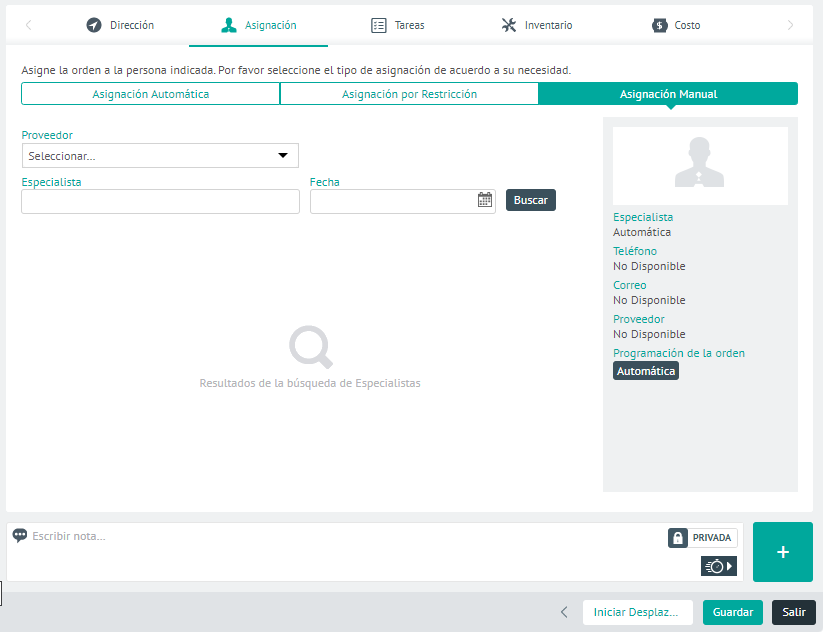 Uma vez que o pedido tenha sido criado, ao abri-lo, no Alocação Você encontrará três tipos possíveis de atribuições especializadas: