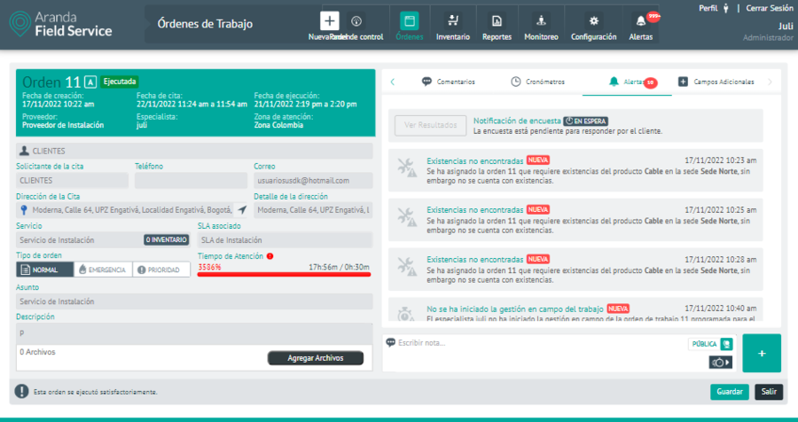 3. O despachante pode adicionar notas e avisos a qualquer momento que ajudem o especialista de campo no desenvolvimento da ordem de serviço. Essas notas ficarão visíveis na categoria Comentários da Ordem de Serviço no aplicativo móvel do Especialista de Campo.