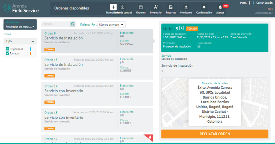 Será apresentada a lista de ordens disponíveis, que neste caso são sempre Open/Unscheduled e não possuem um provedor associado. Por padrão, a listagem é filtrada por pedidos Disponível, com a opção de filtrar também a listagem por pedidos Tomado.