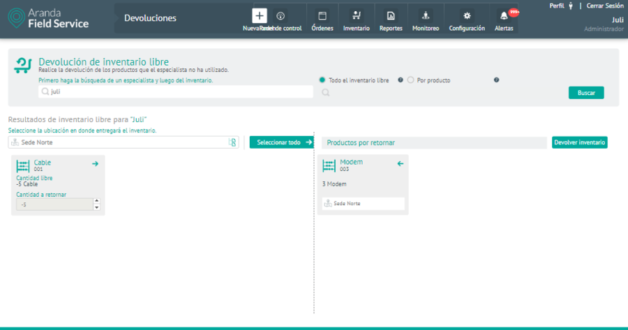 Clique no botão Selecionar tudo para fazer uma pré-seleção de todos os produtos disponíveis para devolução e depois clicar no botão Devolução de inventário. Os itens do especialista serão transferidos para o local do compartimento definido pelo gerente de estoque.