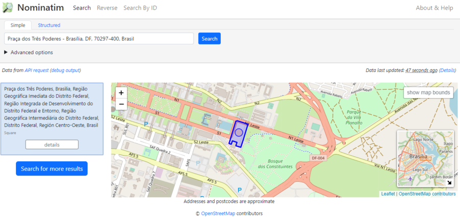 - OpenStreet Maps + Nominatim -> Praça dos Três Poderes - Brasília, DF, 70297-400, Brasil