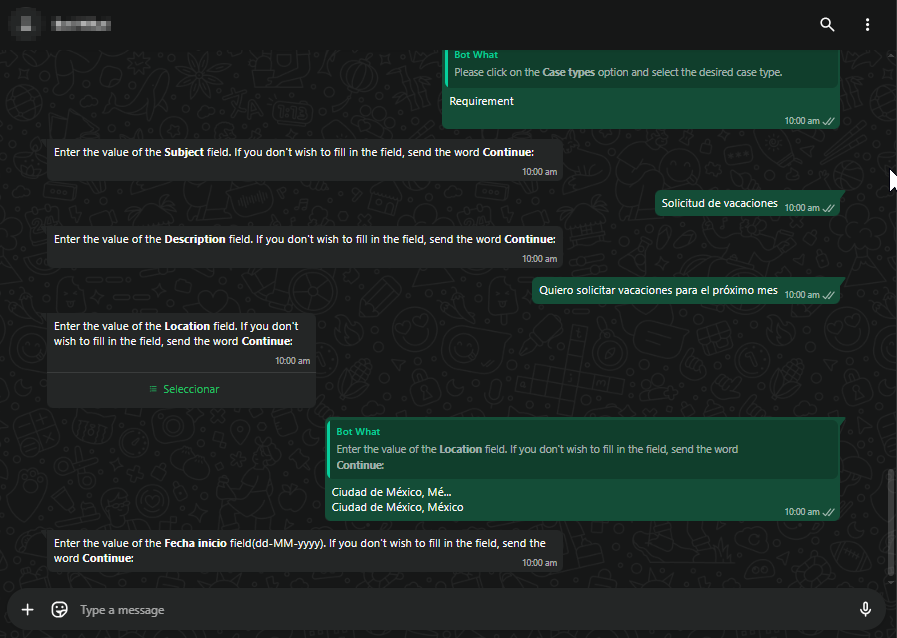 Once the case type is selected, the bot will sequentially request the interface fields (CI, Subject, Description, and Location), as well as the additional fields configured in the category. This will depend on the visibility, editing, and enforcement settings defined for each field.