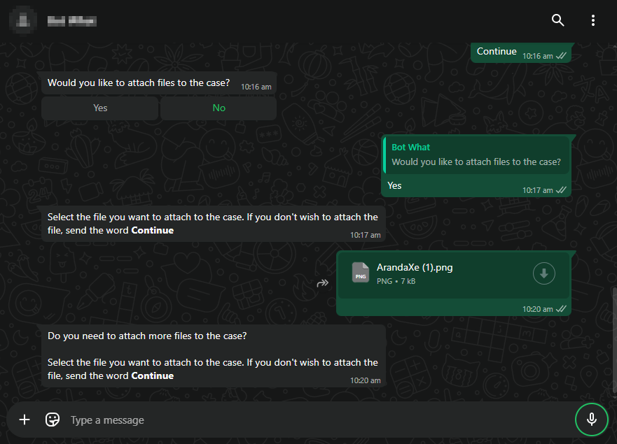 When all fields have been filled in, the bot will ask if the user wants to add attachments to the case.