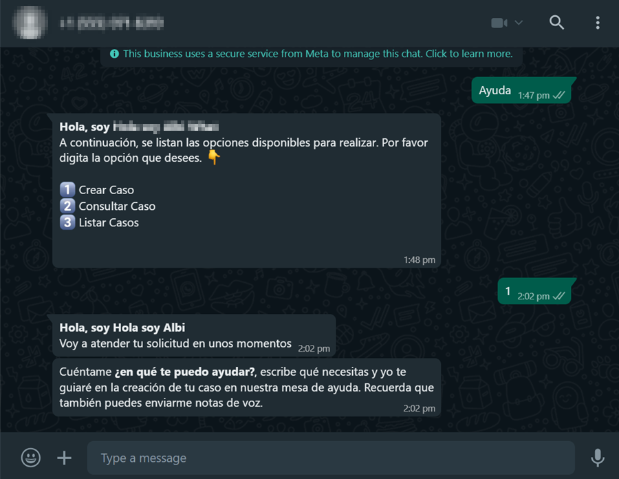 1. From the WhatsApp web or mobile application, start the chat with the Bot’s contact number, invoke it by typing “any text”; the Bot will respond with a greeting message and the available options are listed, select the option Create Case.