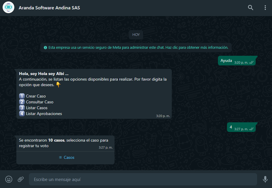 2. The Bot receives the user’s response and performs a search of the cases associated with the user in session that have an active approval process. In case the user has no associated cases, the Bot delivers the message in response No associated cases were found and the option ends List Approvals.
