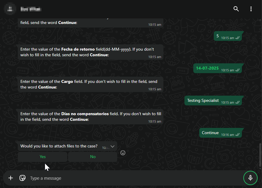 Si el usuario hace clic en el botón “Sí”, el bot solicitará el archivo que desea adjuntar. Una vez enviado, preguntará si desea adjuntar otro archivo.