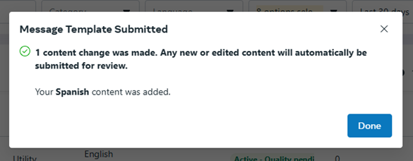 7. Quando a criação do modelo estiver concluída, clique no botão Enviar para revisão. A janela está ativada Confirme os idiomas que deseja enviar onde você pode validar o idioma configurado pela Verificação ativa por padrão. Clique no botão Confirmar.