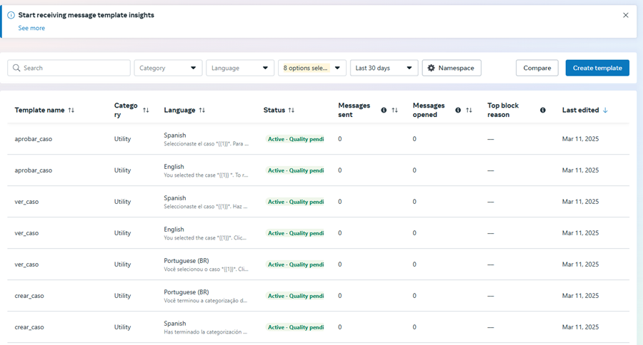 - Nome do modelo: Recomendamos usar um dos seguintes valores: crear_caso, ver_caso, aprobar_caso ou notificacion_whatsapp, de acordo com o modelo personalizado a ser criado.