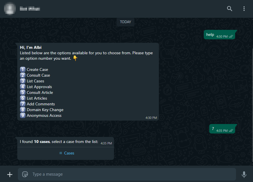 1. Para invocar o Bot, inicie um bate-papo com o número de contato por meio do WhatsApp web ou aplicativo móvel. Em seguida, digite qualquer texto e o Bot responderá com uma mensagem de saudação e as opções disponíveis. Selecione a opção “Adicionar Comentários” Escrever o número correspondente como resposta.
