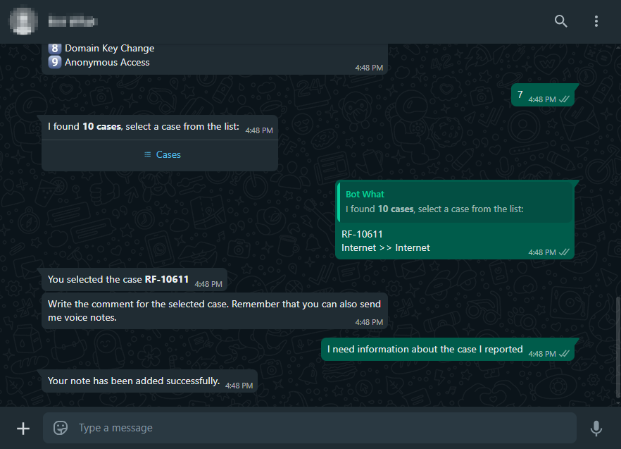 4. O caso selecionado será confirmado na conversa. O bot notificará o número do caso e solicitará a entrada do comentário por texto ou nota de voz.