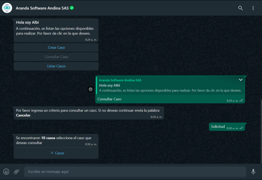 2. A opção Consultar Caso é enviado como resposta à conversa; o Bot exibirá uma mensagem solicitando que você insira um critério para a consulta. Se você não deseja continuar, você deve enviar a mensagem Cancelar.