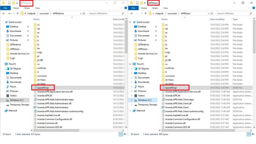 10. To configure the connection string for sites APRAdmin and APRUsers you must go to the installation folder of the sites, and enter the AppSettings of each: