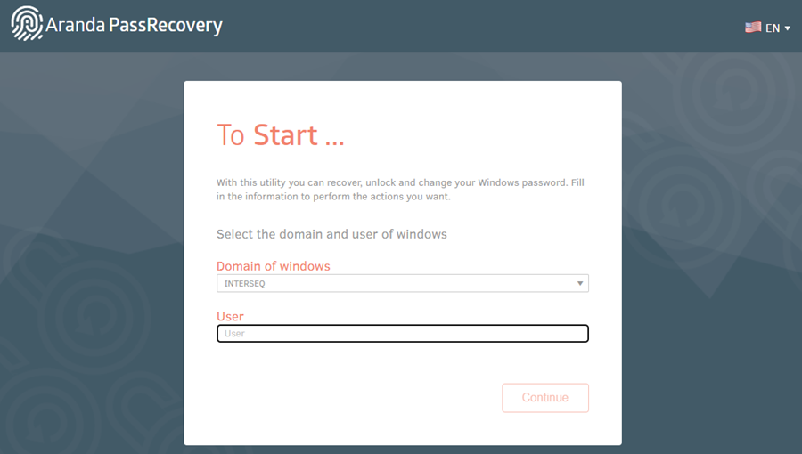 2. Se abrirá la consola de usuarios de Aranda PassRecovery en una nueva pestaña. Ingrese su nombre de usuario y haga clic en el botón Continuar.