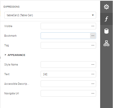 Expressões | Essa opção permite atribuir expressões a várias propriedades de itens de relatório. As expressões são avaliadas em tempo de execução antes que um documento seja gerado. Essa opção de painel ficará visível se as associações de expressão estiverem habilitadas. |