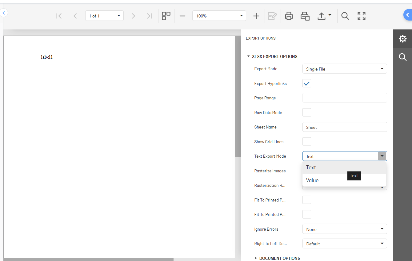 ⚐ Nota: Puede configurar la opción de modo de exportación desde el diseñador de reportes y guardar los cambios para no seleccionar estas opciones cada vez que se visualiza un reporte.
